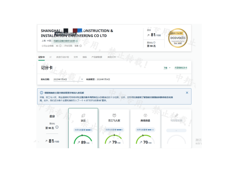 恭贺上海XX建筑安装工程有限公司2025年7月EcoVadis取得81分的优秀成绩